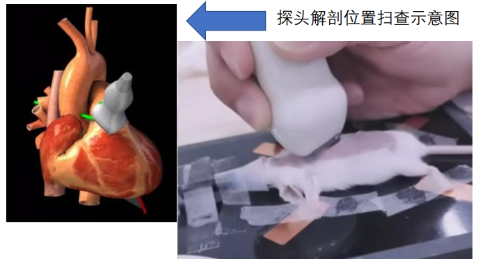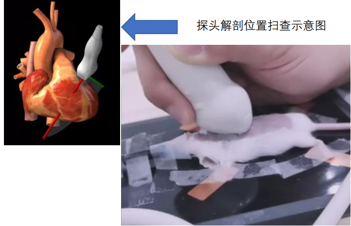 2.心臟短軸切面:探頭放置于胸骨位,Mark點朝向鼠3點鐘位置,探頭尾端稍向前傾斜。