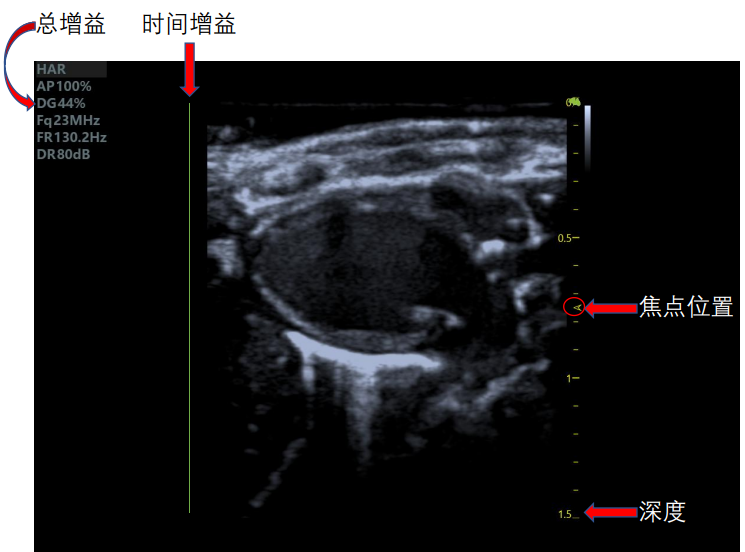 4.增益調節:增益調節至看到組織且不刺眼即可,增大增益會使圖像更加明亮清晰,降低增益,可減少噪聲,使圖像更清晰。